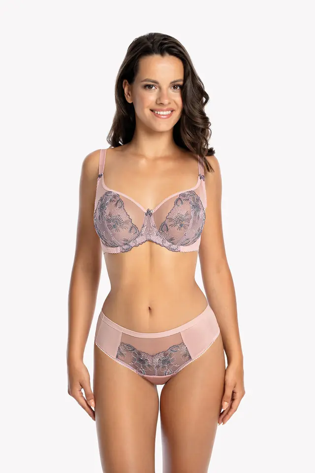 Biustonosz damski typu soft uszyty z pieknej delikatnej koronki, zdobiony haftem o motywie kwiatowym. Ramiączka nieodpinane,regulowane. Skład: 50% poliester, 40% poliamid, 10% elastan.