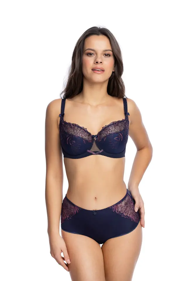 Biustonosz półusztywniany. Miseczki pokryte pięknym haftem, w dolnej części usztywnione pianką. Łączenie fiszbin i ramiączka ozdobione są kokardką. Ramiączka regulowane, nieodpinane. Skład: poliester 50%, poliamid 29%, bawełna 14%,elastan 4%, poliuretan.