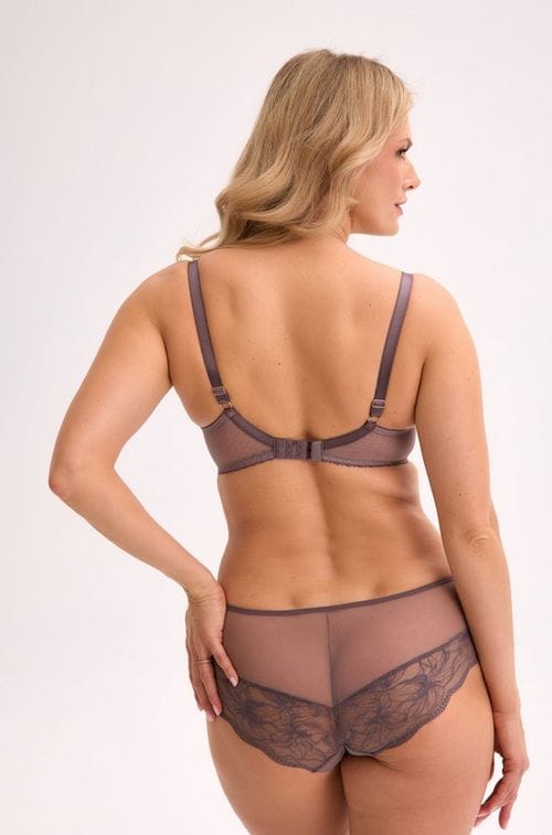 Biustonosz typu semi soft na fiszbinach. Miseczki w dolnej części z kwiatowej koronki, górna linia zakończona siateczką. Ramiączka nieodpinane, regulowane. Skład: 57% poliamid, 18% bawełna,10% elastan, 10% poliester, 5% poliuretan.
