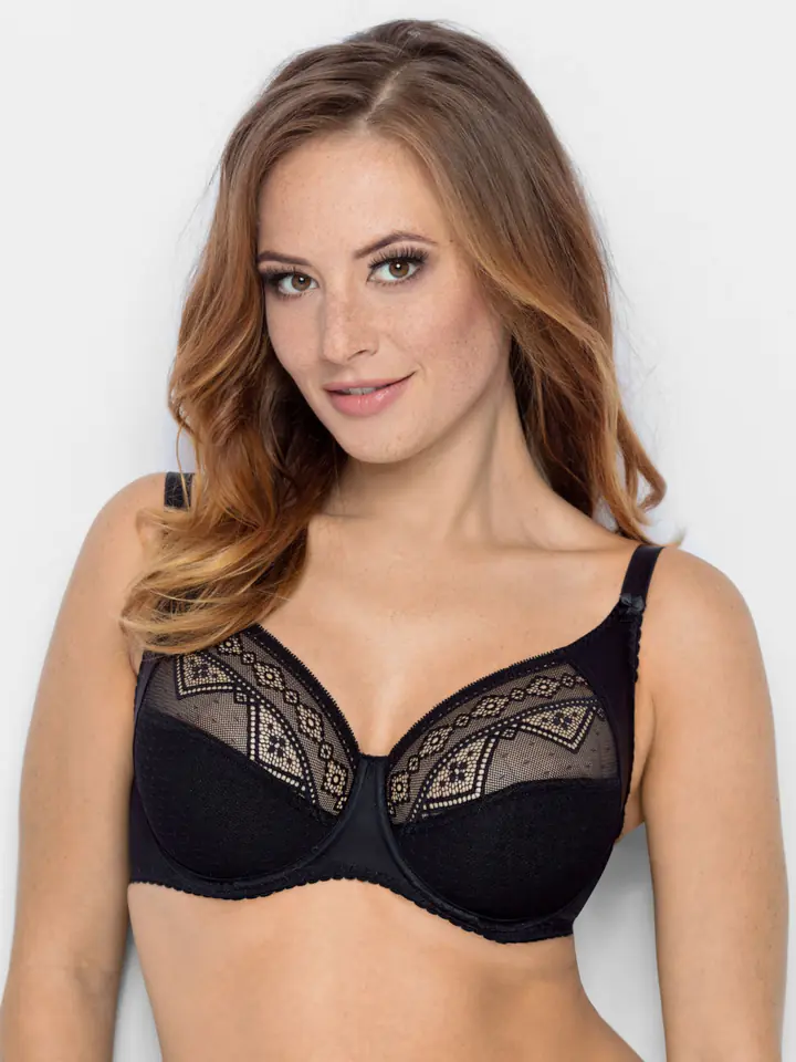Miękki biustonosz z fiszbinami, idealny dla Pań z większym biustem. Góra miseczek z koronki, dół z podwójnej - dobrze trzymającej tkaniny. Ramiączka nieodpinane. Idealnie utrzymuje biust. Skład: 82% Poliamid, 18% Elastan.