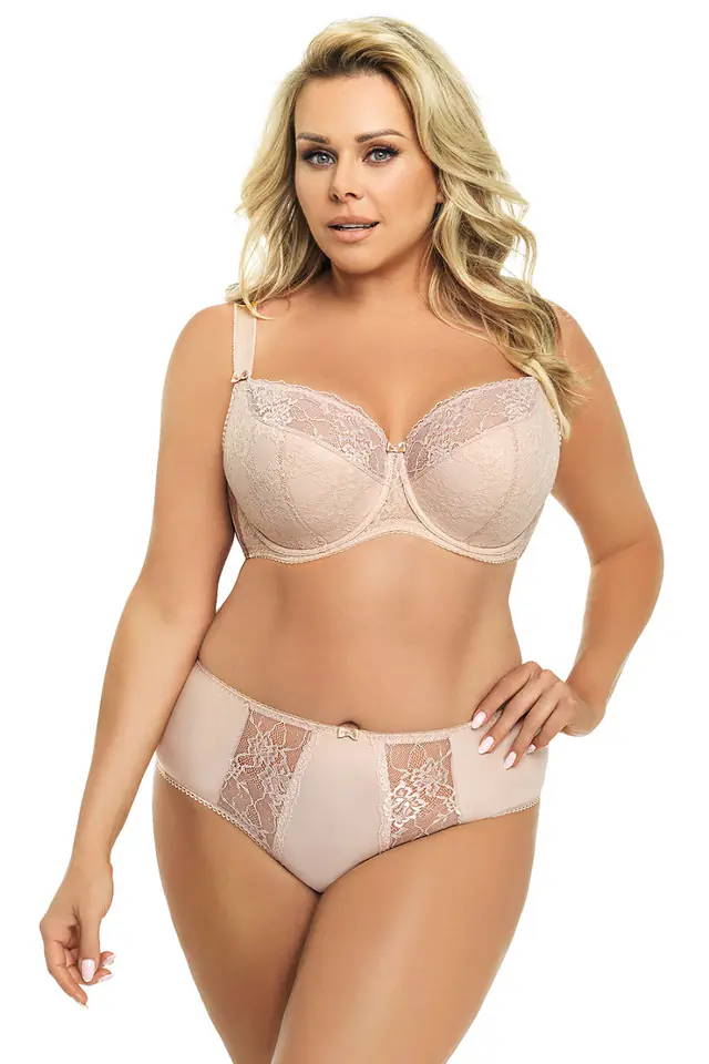 Półusztywniany biustonosz wykonany z pięknej, delikatnej koronki elastycznej. Dolna część miseczki usztywniona pianką, która dodatkowo od wewnątrz jest podszyta bawełną.