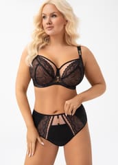 Biustonosz typu soft, na fiszbinach. Miseczki pełne, zdobione haftem, podszyte dodatkowo siateczką, ramiączka nieodpinane, regulowane. Skład: 90% poliamid, 7% elastan, 3% poliester.