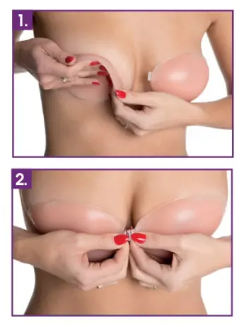 Biustonosz samonośny bez ramiączek ani zapięć na plecach,tylko z przodu. Miseczki biustonosza od wewnątrz pokryte specjalnym klejem medycznym, dzięki któremu doskonale trzyma się na piersiach. Skład: 95% Poliuretan, 3%Poliester, 2%Silikon.