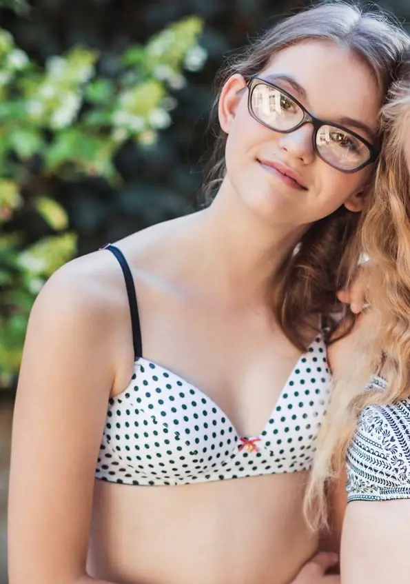 Biustonosz dla nastolatek z miłej i przyjemnej dla ciała wzorzystej bawełny. Miseczki delikatnie usztywnione gąbeczką, bez fiszbin, ramiączka z regulacją. Skład: 95% bawełna, 5% elastan.