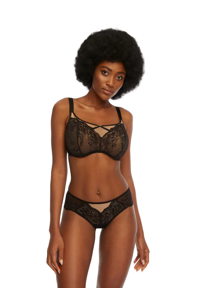 Biustonosz typu soft, miękkie miseczki w kolorze czarnym. Efektowna warstwa siateczki imitująca top, boczki z elastycznego materiału, wzmocnione pionową fiszbiną. Ramiączka nieodpinane, z regulacją. Skład: 65% poliamid, 25% poliester, 10% elastan.