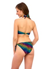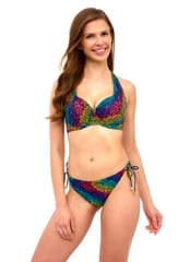 Niezwykle kolorowy, wakacyjny kostium Elena, hit sezonu 2025.Biustonosz bikini wykonany z dzianiny w wielu pięknych, wyrazistych kolorach. Miseczki z żelową wkładką push-up na fiszbinie. Model przeznaczony dla kobiet z małym i średnim biustem. Konstrukcja biustonosza doskonale podtrzymuje i uwydatnia biust. Kostium wiązany na szyi i zapinany na plecach. Do skompletowania całości polecamy klasyczne figi bikini wiązane po bokach, wykonane z dzianiny w kolorowe kropeczki, która idealnie podkreśli opaloną skórę. Do wyboru dostępna jest również spódniczka, z wszytymi majteczkami, która tworzy z górą kostiumu niepowtarzalną całość. Skład surowcowy: 85% Poliamid, 15% Elastan