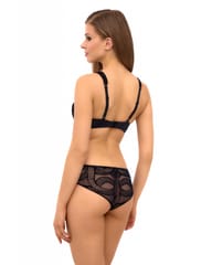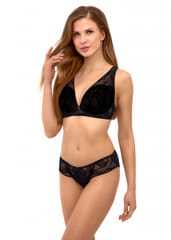 Zmysłowy, a zarazem elegancki biustonosz na fiszbinach. Stworzony dla kobiet z średnim oraz większym biustem. Miękkie miseczki z pionowym cięciem wykonane z czarnej koronki wzmocnionej szyfonem. Konstrukcja biustonosza zapewnia pełen komfort noszenia oraz idealne podtrzymanie biustu. Między miseczkami ozdobna kokardka. Ramiączka nieodpinane, z możliwością regulacji. Zapięcie na haftki. Skład surowcowy: Biustonosz - 85% Poliamid, 15% Elastan