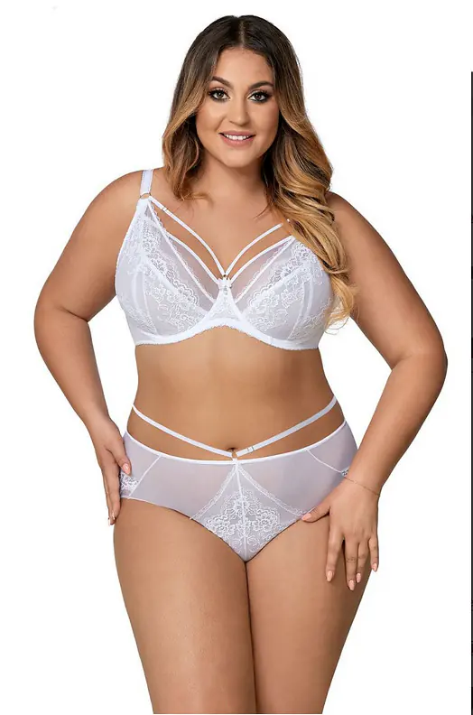Biały, koronkowy biustonosz na średnie i większe piersi, projektu znanej marki Ava Lingerie. Zdobiony subtelnymi paskami na dekolcie, które wraz z biustonoszem tworzą modną i zarazem zmysłową całość. Paseczki o regulowanej długości. Koronka z kwiatowym motywem, prezentuje się elegancko i pięknie. Skład: 88% poliamid, 8% bawełna, 4% elastan.