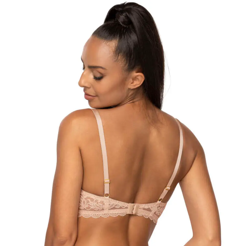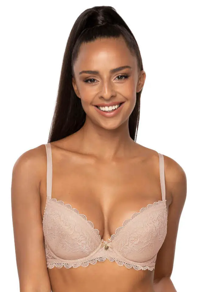Estelle, delikatny i subtelny model z miseczkami push up i obniżonym środkiem. W całości wykonany ze zjawiskowej koronki. Po środku mała kokardka z biżuteryjną zawieszką. Skład: 29% poliamid, 26% bawełna, 22% poliuretan, 20% poliester, 3% elastan.