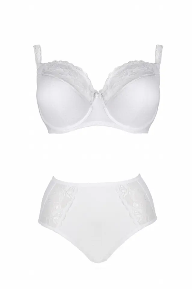 Piękny biustonosz z fiszbinami utrzymany w białej kolorystyce. Jest to model półusztywniany - semi soft, przeznaczony dla pań hojniej obdarzonych przez naturę. Wyśmienicie zbiera piersi i utrzymuje je na właściwym miejscu. Górna część biustonosza wykonana jest z koronki natomiast dół to dzianina w delikatne kropeczki. Biustonosz posiada regulowane ramiączka. Do skompletowania idealnej całości polecamy wysokie figi. Skład surowcowy: 70% Poliamid, 20% Elastan, 10% Bawełna