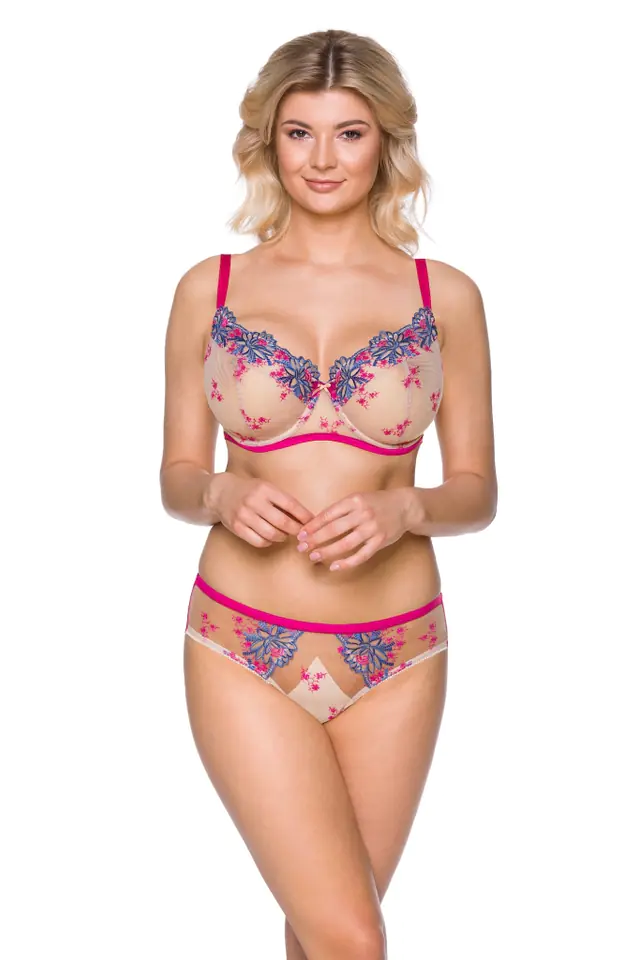 Biustonosz z miękkimi miseczkami na fiszbinie. Model zachowany w bardzo ciekawej kolorystyce. Podstawa, tył i ramiączka biustonosza w kolorze fuksji. Miski wykonane z beżowego plenu z kontrastującym motywem kwiatowym. Ramiączka regulowane, nieodpinane. Skład surowcowy biustonosz: 85% Poliamid, 15% Elastan