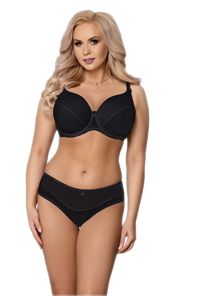 Biustonosz usztywniany (full cup) z miseczkami na fiszbinach.Boczki i tył z elastycznej dzianiny.Po bokach pionowe fiszbiny stabilizujące.Ramiączka o regulowanej długości zakończone kokardką.Dolna część miseczek wykończona prążkowaną dzianiną.Tkanina: 75% poliamid, 15% elastan, 5% poliester, 5% bawełna.Do kompletu polecamy figi VF-11.