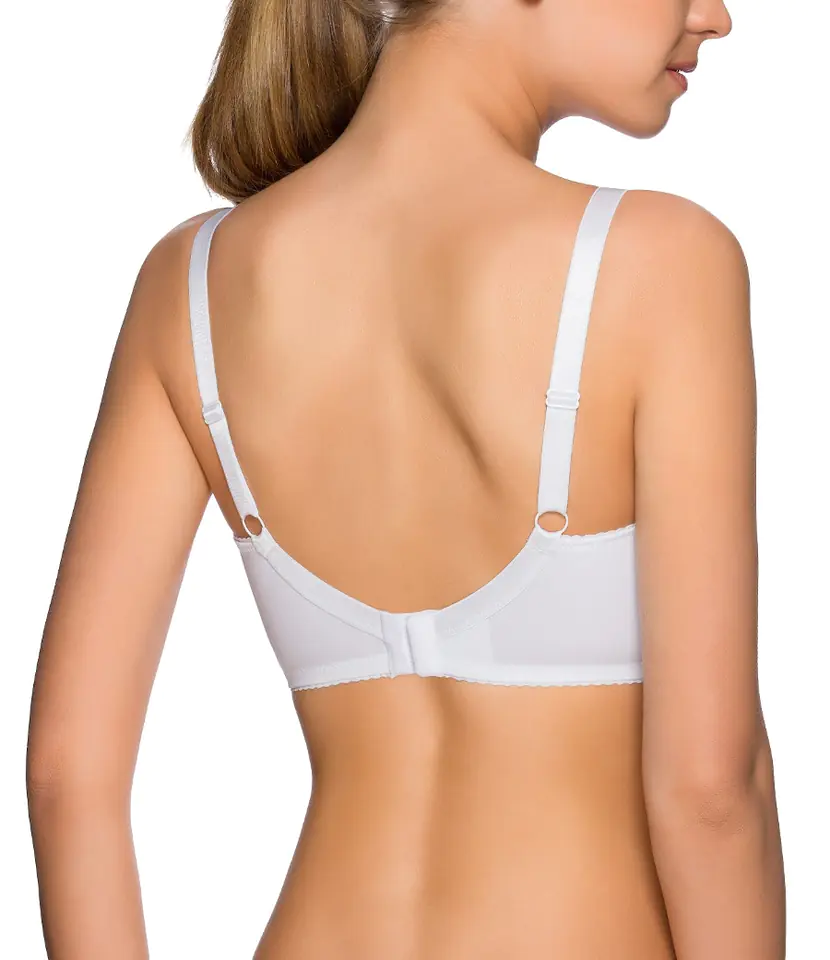 Biustonosz usztywniany na fiszbinach z zabudowanymi miseczkami typu full cup. Model dla Pań preferujących wysokozabudowane, pełne miseczki okalające całe piersi. Model utrzymany w tonacji śnieżnej bieli.