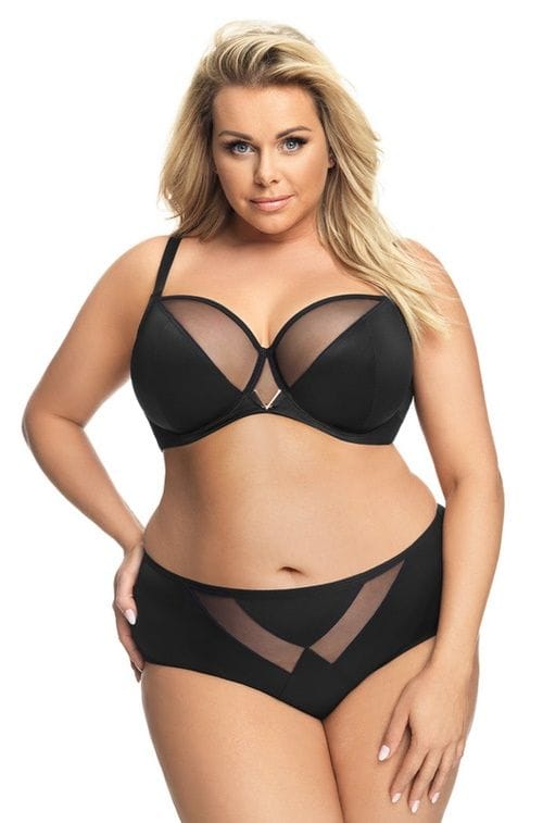 • Efektowny biustonosz w czarnym kolorze, w którym od razu się zakochasz. Propozycja znanej marki Gorsenia, skierowana na duże i średnie biusty. Model kusi delikatnością i tylko pozorną prostotą, zaskakuje piękną, V-wstawką w złotym kolorze, elementami z transparentnego tiulu i przede wszystkim bardzo dobrą konstrukcją. Miseczki soft, na fiszbinach. Skład: 90% poliamid, 7% elastan, 3% poliester.