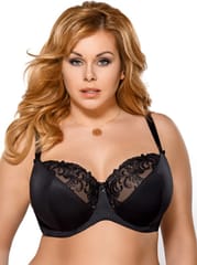 Biustonosz Victoria Czarny K378● klasyczny, miękki z serii BIG● z gładkich surowców połączonych eleganckim haftem● miseczki dobrze zbierają biust i utrzymują na właściwym miejscu● ładnie eksponuje dekolt● dolne części miseczek ze stabilnej, gładkiej dzianiny● górna część z haftu dla wzmocnienia podszytego delikatną siateczką● baskinka z gładkiej dzianiny, wzmocnionej tiulem● miseczki wyprofilowane drutem okalającym piersi● piersi są zebrane do środka, podniesione i utrzymują piękny, zaokrąglony kształt● na środku, pomiędzy miseczkami kokardka ozdobiona malutką biżuterią● boczki wykonane ze sprężystej, odpornej na rozciąganie dzianiny typu lycra● fiszbiny pionowe we wszystkich rozmiarach ● ramiączka regulowane, nieodpinane, różnej szerokości w zależności od rozmiaru● na łączeniach z miskami mała kokardka● zapięcie: haftka dwu- i trzyrzędowa w zależności od rozmiaru z trzystopniow