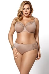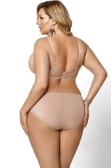 Beżowy biustonosz typu soft, z piękną, koronkową górą. Miseczki z fiszbinami, o profesjonalnym podkroju, bardzo dobrze zbierają i modelują piersi. Środek z gustowną przywieszką. Ramiączka o regulowanej długości. Obwód elastyczny, zapinany na haftki. Skład: 90% poliamid, 7% elastan, 3% poliester.
