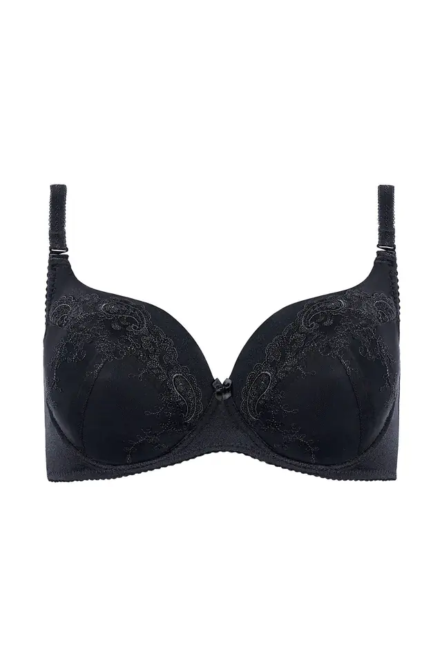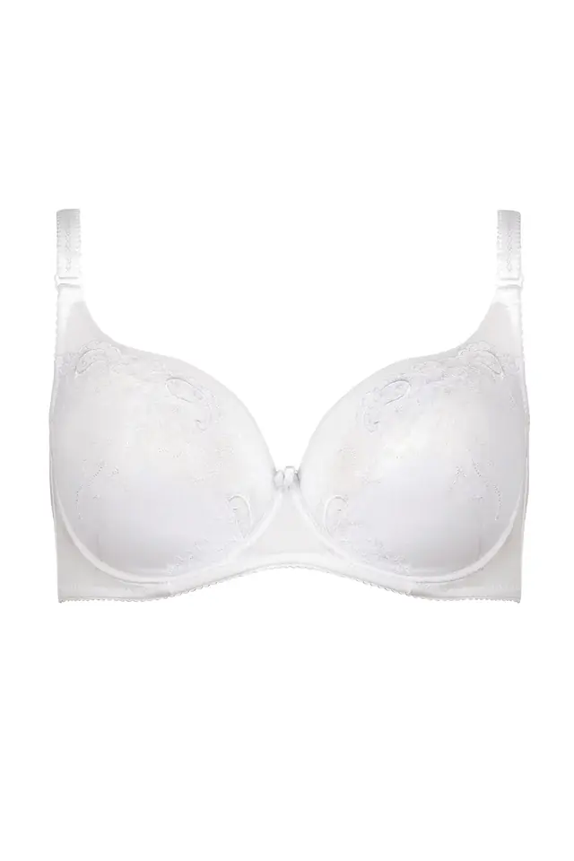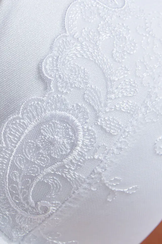 Klasyczny i elegancki biustonosz usztywniany doskonale podtrzymuje biust. Wykonany z gładkiej dzianiny ozdobionej pięknym haftem. Między miseczkami delikatna kokardka. Miseczki trzyczęściowe, uszyte z cienkiej pianki gorseciarskiej. Wewnętrzna część miseczek wyściełana bawełną. Plecy biustonosza wykonane dzianiny gładkiej. Odpinane, regulowane ramiączka. Pionowe fiszbiny boczne zapobiegające marszczeniu się boczków. MISKI – BUDOWA: Miski trzyczęściowe – cięcie skośne oraz pionowe cięcie na dolnej misce.MISKI – TYP I WYKOŃCZENIE: Miseczki szyte, wykonane z cienkiej pianki gorseciarskiej, w całości ozdobionej na zewnątrz dzianiną, koronką czy też haftem. Lekko przedłużona miska w miejscu łączenia z ramiączkiem. Wewnętrzna część miseczek wyściełana jest przyjemną bawełną.ŚRODEK: Środek lekko podwyższony.TYP BIUSTU I PRZEZNACZENIE: Biustonosz przeznaczony do średnich i dużych biustów. Sprawdzi się przy bardziej zakrytych dek