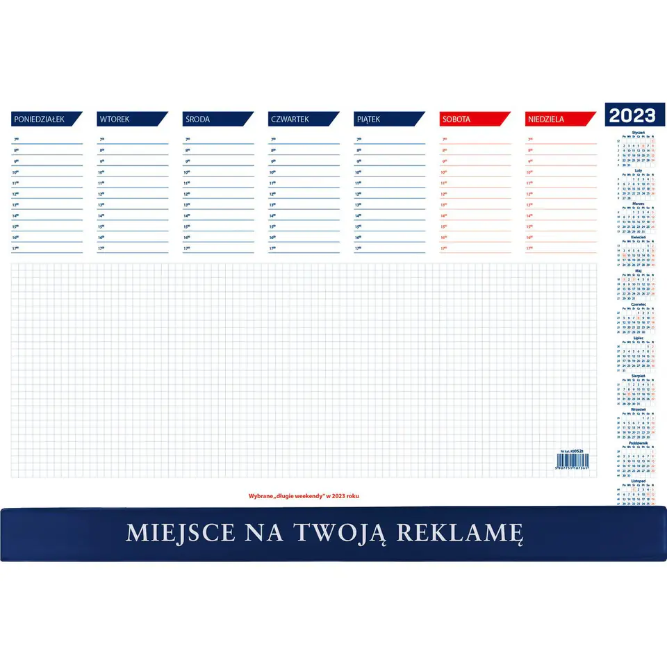 Praktyczny podkład na biurko z dużym obszarem do notowania, drukowany na papierze białym. Uchylna listwa PCV w kolorze granatowym w dolnej części kalendarza. Na listwie istnieje możliwość wykonania nadruku reklamowego na obszarze 470 x 30 mm.- układ: tygodniowy