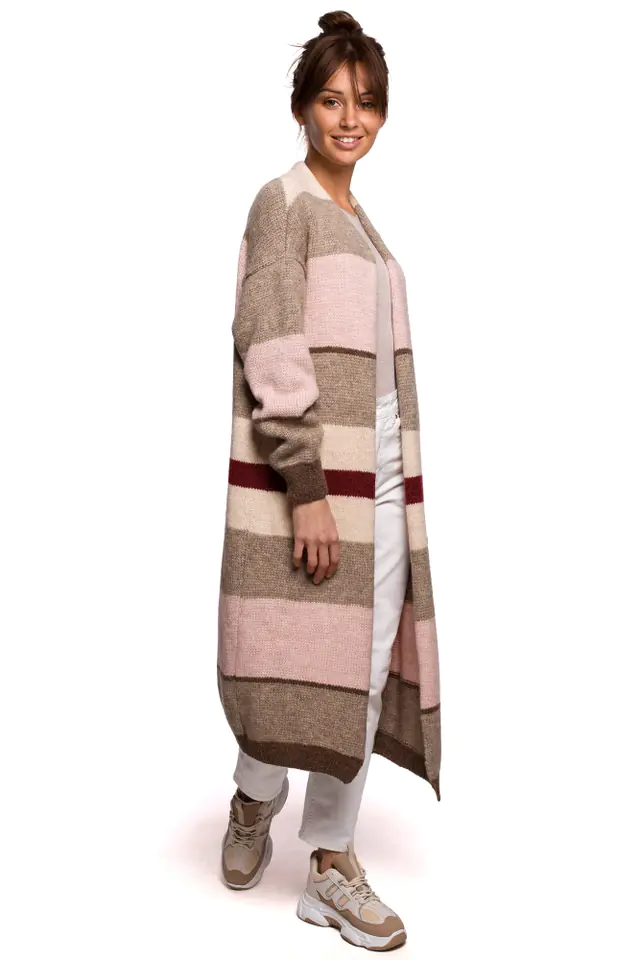 Długi, przyjemny w dotyku kardigan z unikalnym wzorem w różnokolorowe poziome pasy.