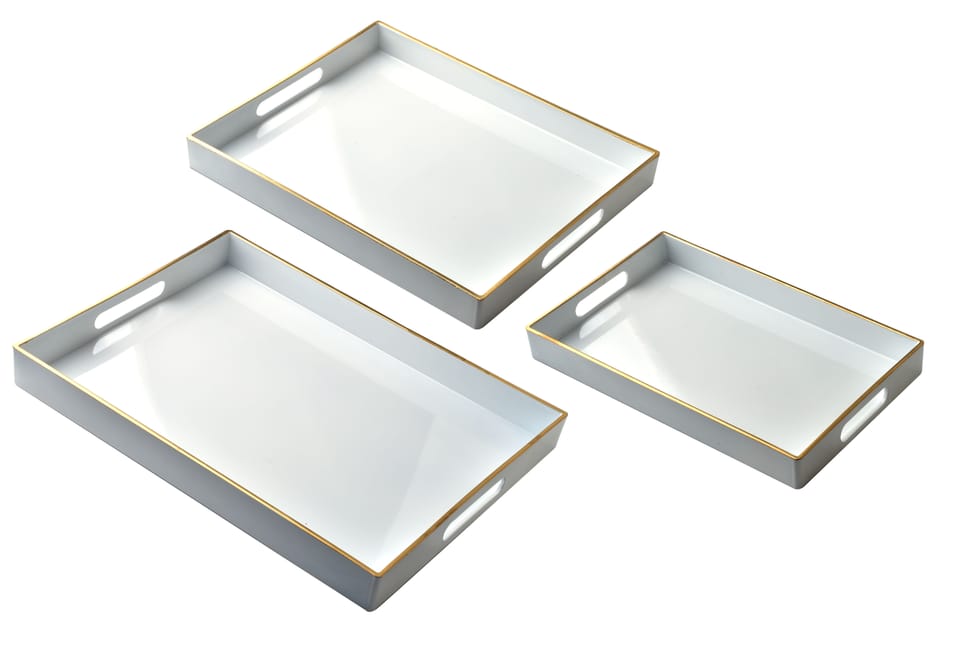 BLANCHE WHITE . komplet 3 białych tac dekoracyjnych | Harmonia, elegancja i lekkośćWprowadź świeżość i ponadczasowy styl do swojego wnętrza z zestawem BLANCHE WHITE . trzema dekoracyjnymi tacami w klasycznej bieli. To funkcjonalny i estetyczny dodatek, który sprawdzi się zarówno podczas serwowania, jak i w roli stylowej podstawy pod domowe dekoracje.Co wyróżnia BLANCHE WHITE?Czystość i uniwersalność . biel pasuje do każdego wnętrza, dodając mu lekkości i elegancji.Zestaw trzech rozmiarów . tacki idealne do serwowania przekąsek, kawy, herbaty czy jako baza pod ozdoby lub kosmetyki.Wszechstronne zastosowanie . do jadalni, salonu, sypialni czy łazienki . wszędzie tam, gdzie liczy się styl i funkcjonalność.Praktyczny element wystroju . subtelna forma sprawdzi się w nowoczesnych, skandynawskich i klasycznych aranżacjach.Świetny pomysł na prezent . estetyczne opakowanie i ponadczasowy design sprawiają, że komplet sprawdzi się jako elegancki upominek.Wymiary tac:. Duża: 40 x 30 x 4 cm. Średnia: 35 x 25 x 3,5 cm. Mała: 30 x 20 x 3,5 cmMateriał: tworzywo sztuczneKolor: biały