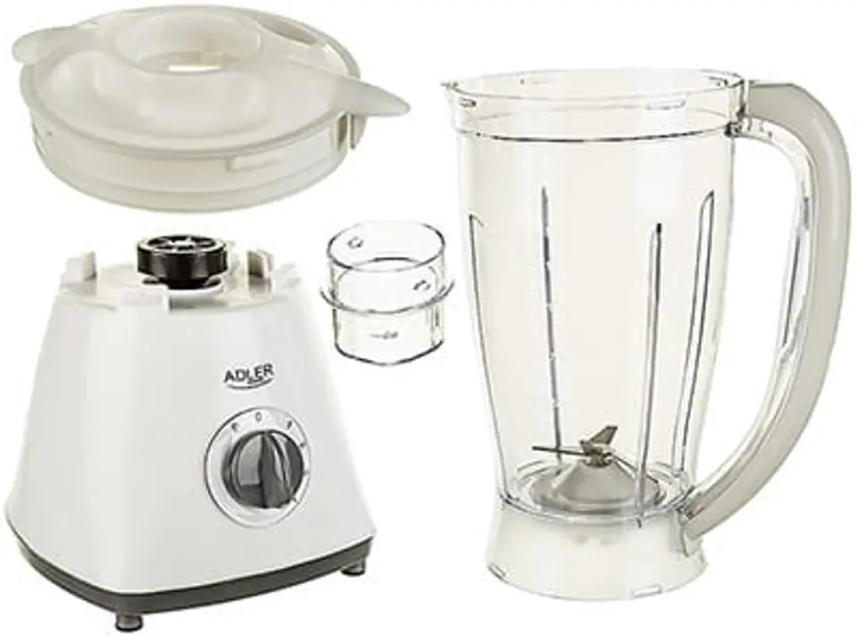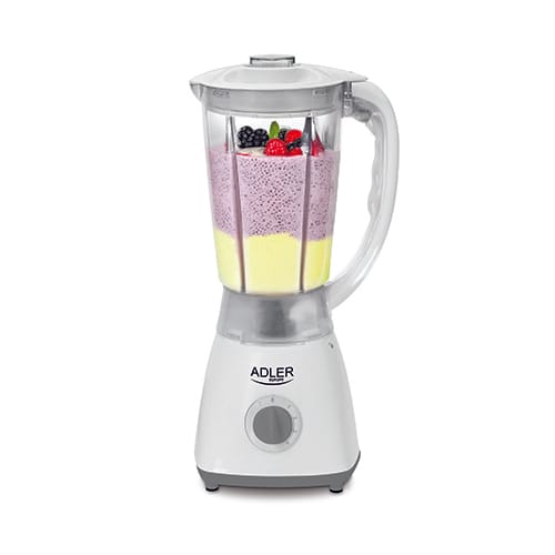 Nowoczesny, biało-szary blender kielichowy Adler sprawdzi się w każdej kuchni na piątkę. Obudowa podstawy urządzenia, w której mieści się silnik, wykonana jest z białego tworzywa. Natomiast wykończenie dolnej części obudowy oraz pokrętło uruchamiające urządzenie to tworzywo w kolorze szarym. Plastikowy dzbanek ma pojemność 1,5 litra. W podstawie dzbanka znajduje się 4-ramienne ostrze z bardzo wytrzymałej stali szlachetnej, które doskonale rozdrabnia i miesza i to te miękkie, jak i te twarde produkty. Dwa podwójne noże z gładkim i ząbkowanym ostrzem świetnie miksują różnorodne owoce oraz warzywa. Dzbanek z przykręconą częścią wyposażoną w ostrza zakładamy na podstawę i lekko przekręcamy w prawo. Bezpieczne połączenie zapewnią cztery zaczepy. Utrzymanie całego urządzenia w miejscu gwarantują cztery nóżki zaopatrzone w gumowe przyssawki. Energooszczędny silnik ma moc 450W Blender posiada cztery prędkości pracy oraz funkcję PULSE, która uruchamia przerywaną pracę urządzenia przy maksymalnej ilości obrotów.