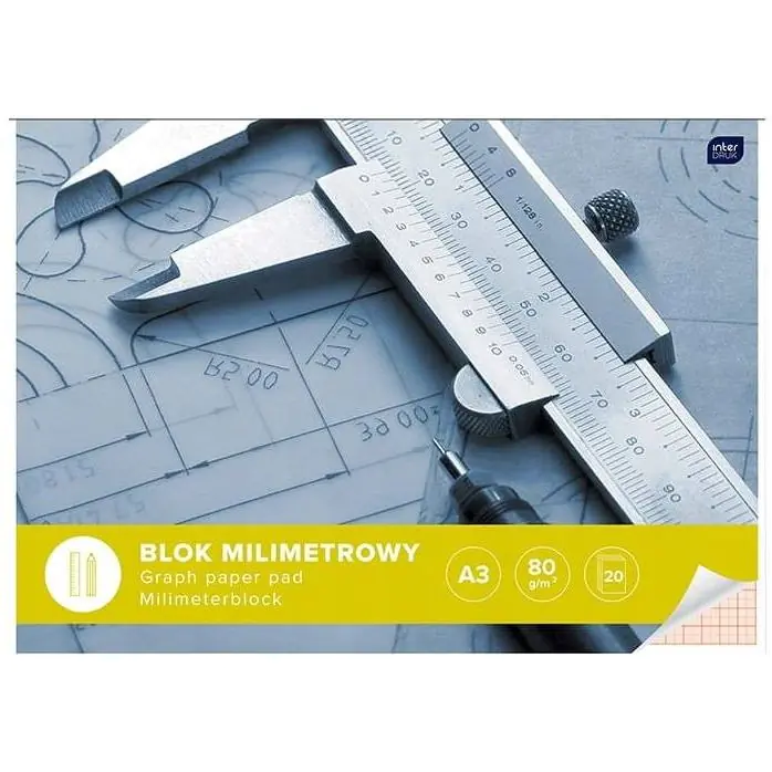 Blok milimetrowy marki INTERDRUK w rozmiarze A3 oferuje 20 kartek papieru, podzielonego na milimetry, aby pomóc w tworzeniu dokladnych wykresów, diagramów i rysunków technicznych.