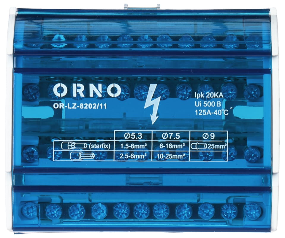 Liczba zacisków: | 11 w każdej listwie : 7 x 1.5 mm² ... 6 mm² (z tulejką kablową) / 2.5 mm² ... 6 mm² (linka bez tulejki) 2 x 6 mm² ... 16 mm² (z tulejką kablową) / 10 mm² ... 25 mm² (linka bez tulejki) 2 x 25 mm² (z tulejką kablową) |