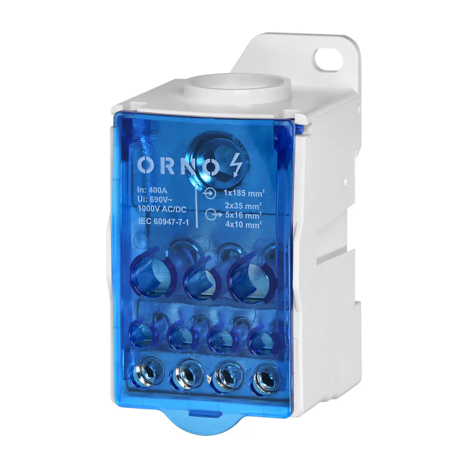 Blok rozdzielczy 400A, zacisk wejściowy 1x185mm?, zaciski wyjściowe 4x10 i 5x16 i 2x35mm?,wygodne mocowanie na szynie DIN