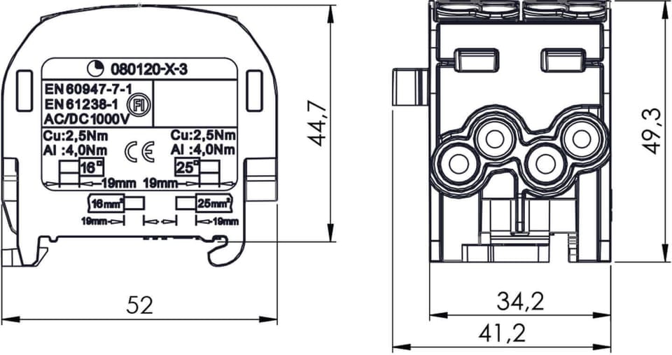 Prąd znamionowy Cu152 A (2 x 16 mm²) / 101 A (1 x 25 mm²)