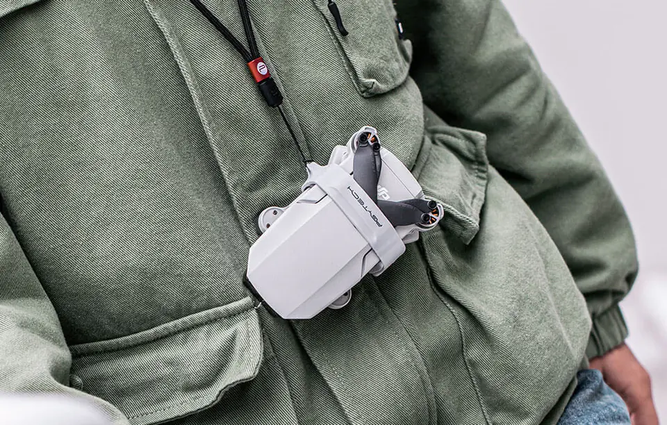 Do zestawu dołączona jest smycz, która umożliwia zamontowanie do niej drona i zawieszenie go na szyi. Idealne rozwiązanie w chwilach gdy potrzebne są dwie ręce, a dron nie może zostać odłożony np. na mokrą trawę.