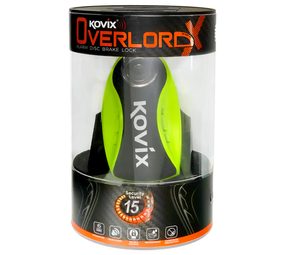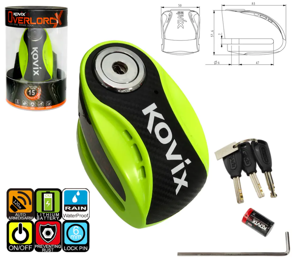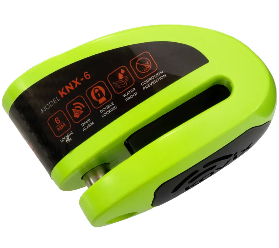 Blokada tarczy hamulcowej z wbudowanych alarmem o natężeniu dźwięku 120 dB z możliwością ustawiania opcji syreny ON/OFF. Zamek ze stali nierdzewnej i wodoodporne podzespoły elektryczne gwarantują ochronę przed korozją i niezawodność w każdych warunkach atmosferycznych. Blokada wyposażona jest w długo pracującą i przyjazną dla środowiska litową baterię. Zabezpieczenie blokuje koło bolcem o średnicy 6 mm, przez co uniemożliwia jazdę i ruch motocykla lub skutera.