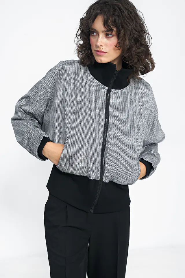 Kurtka w czarną jodełkę ma krótki, prosty fason, który świetnie prezentuje się w połączeniu ze spodniami i spódnicami z wysokim stanem. Minimalistyczny fason dobrze sprawdza się w jesiennych, miejskich stylizacjach na dzienne i wieczorowe okazje. Kurtka ma modne i praktyczne przeszycia oraz wygodne kieszenie. To ponadczasowy element garderoby. Skład: 65% wiskoza, 30% poliester, 5% poliuretan Modelka na zdjęciu ma 176 cm wzrostu i ma sobie rozmiar 36.