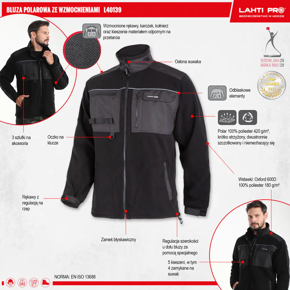 MATERIAŁ: Polar 100% poliester 420 g/m?, krótko strzyżony, dwustronnie szczotkowany i niemechacący się. Wstawki: Oxford 600D 100% poliester 180 g/m?. 5 kieszeni, w tym 4 zamykane na suwak. Zamek błyskawiczny. Osłona suwaka. Odblaskowe elementy. Oczko na klucze. 3 szlufki na akcesoria. Rękawy z regulacją na rzep. Regulacja szerokości u dołu bluzy za pomocą specjalnego ściągacza. Wzmocnione rękawy, karczek, kołnierz oraz kieszenie materiałem odpornym na przetarcia. NORMA: EN ISO 13688.