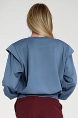 Krój oversize. Okrągły dekolt. Długi rękaw, z przedłużeniem na ramionach, zakończony długim ściągaczem. Poduszki na ramionach. Wkładana przez głowę. U dołu wysoki ściągacz. Skład: 45% wiskoza, 38% poliester, 12% nylon, 5% spandex Modelka na zdjęciu ma 176 cm wzrostu i ma sobie rozmiar 36.