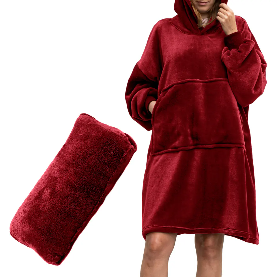 Mięciutka bluza oversize, którą pokochasz Bluzair – Bluza koc to ciepła i niezwykle miękka bluza z kapturem, która otula ciało niczym ulubiony koc.4 w 1: sprawdzi się jako komfortowa bluza, ciepły koc, miękki szlafrok i wygodna poduszka.Obłędnie miła w dotyku i idealna bluza dla osób, które łatwo marzną.Z przyjemnością ubierzesz ją w domu i na zewnątrz. Sprawdzi się też jako bluza damska i męska.Ma jeden uniwersalny rozmiar (oversize) – nie musisz się się nad nim zastanawiać, żeby podarować ją na prezent! Wyprodukowano w Polsce Koco-bluza Bluzair została zaprojektowana i uszyta w Polsce.Bluza została gruntownie przemyślana i jest idealnie dostosowana do polskich warunków – nie za gruba i nie za cienka.Posiada mocne, podwójne szwy oraz ściągacze, dzięki którym rękawy nie zsuwają się z dłoni. Jest też wystarczająco duża, by z podkulonymi nogami dało się nią przykryć stopy. By schować się przed jesienią i zimą Bluza koc to idealny gadżet, dzięki któremu schowasz się przed jesienią i przetrwasz zimowe mrozy.Otula niczym koc, ale nie zsuwa się z ciała, dlatego umila czytanie książek, oglądanie filmów czy picie rozgrzewających napojów. W przeciwieństwie do koca nie trzeba jej z siebie ściągać, gdy chce się wstać z kanapy.Przyda się też po kąpieli - wsuń ją na siebie, a już nigdy nie zechcesz nosić zwykłego szlafroka.Kocobluza zapewni Ci komfortowe ciepło, nawet gdy temperatura grzejników w domu pozostawia wiele do życzenia. To też idealny prezent dla miłośniczki lub miłośnika jesieni. Na wszystkie pory roku To produkt całoroczny, nie tylko do noszenia w domu! Przez resztę roku nie musi leżeć w szafie.Chłodne wieczory i poranki zdarzają się wiosną, a nawet w lecie, więc możesz założyć ją na taras czy do ogrodu.Idealna na wyjazd, szczególnie pod namiot lub na kemping.Sprawdzi się na działce i na pikniku.Zabierz ją na żagle – stanie się nie tylko bluzą, ale i praktyczną poduszką do spania. Kompaktowa - łatwo zmienić ją w poduszkę Twoja ciepła bluza może w mgnieniu oka zamienić się w mięciutką i wygodną poduszkę.Zabierzesz ją ze sobą wszędzie tam, gdzie przydadzą Ci się obie rzeczy, np. pod namiot, na jacht, na kemping lub piknik.Wystarczy w łatwy sposób wepchnąć ją do przedniej kieszeni. Dzięki temu masz więcej miejsca na inne potrzebne rzeczy.Możesz też zawinąć ją w poduszkę, gdy masz mało miejsca w szafie. Na kanapie czy fotelu będzie wyglądać jak standardowa poduszka.