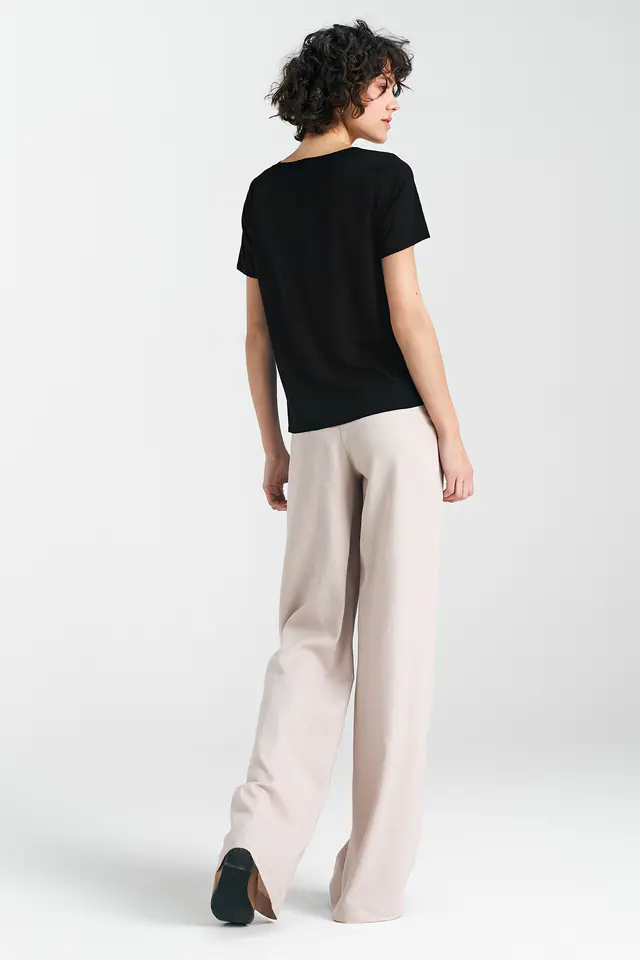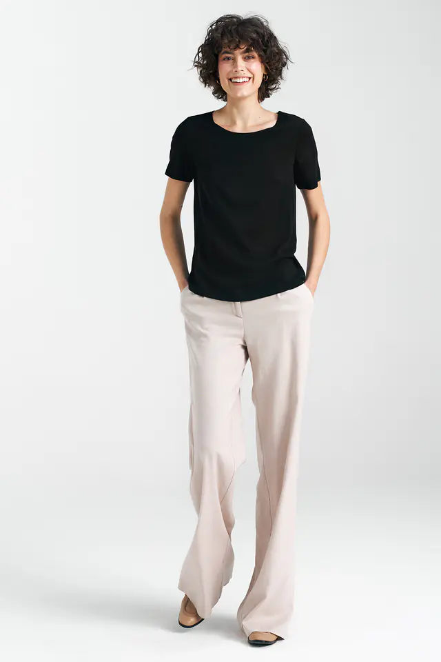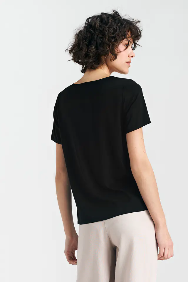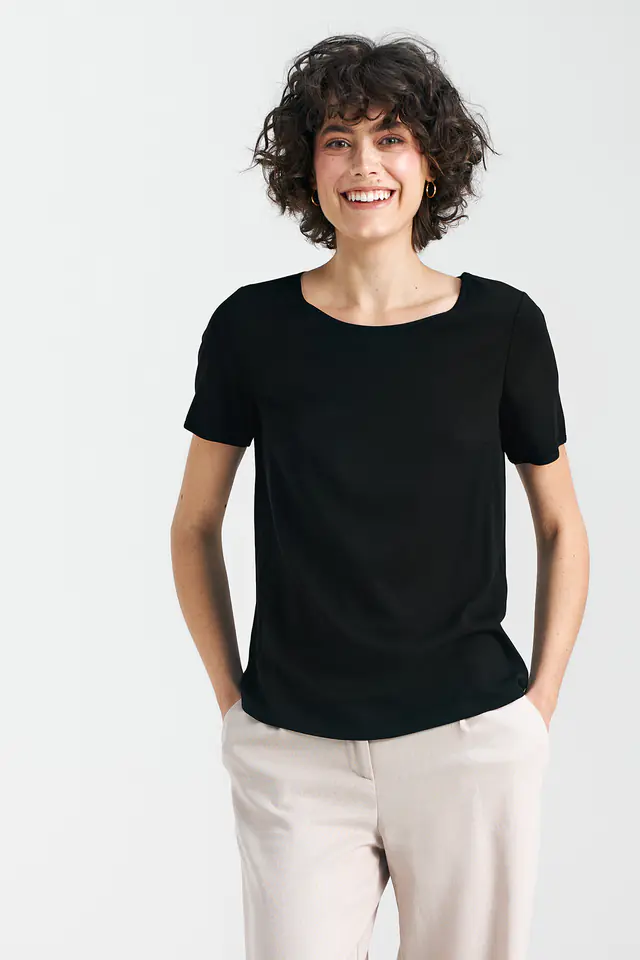 Krój regular. Materiał wiskoza. Dekolt okrągły i krótki rękaw wykończony lamówką. Wkładana przez głowę. Model basic. Skład: 100% wiskoza Modelka na zdjęciu ma 176 cm wzrostu i ma sobie rozmiar 36.