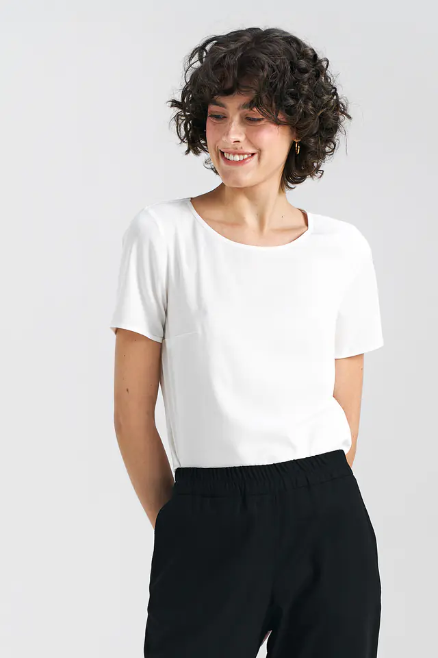 Krój regular. Materiał wiskoza. Dekolt okrągły i krótki rękaw wykończony lamówką. Wkładana przez głowę. Model basic. Skład: 100% wiskoza Modelka na zdjęciu ma 176 cm wzrostu i ma sobie rozmiar 36.