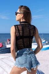 Belles to czarna, półprzezroczysta bluzka zaprojektowana jako sexy dodatek do efektownej stylizacji bądź jako uzupełnienie plażowego looku. Krój bez rękawów. Całość miękka i elastyczna. Skład: 93% poliamid, 7% elastan.