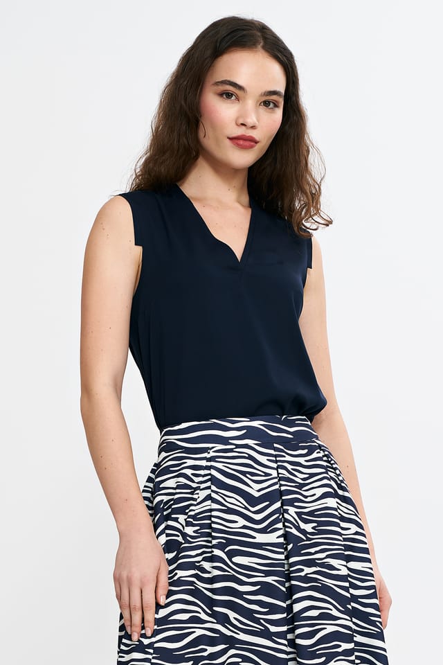 Krój regular. Materiał wiskozowy. Dekolt w kształcie litery V. Bez rękawów. Dekolt i ramiona wykończone pliską. Wkładana przez głowę. Skład: 100% wiskoza Modelka na zdjęciu ma 176 cm wzrostu i ma sobie rozmiar 36.