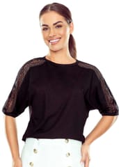 Elegancka bluzka damska wykonana z miękkiej i elastycznej wiskozy ramiona i rękawy zdobi efektowna, koronkowa wstawka. Skład: 90% wiskoza, 5% poliamid, 5% elastan.