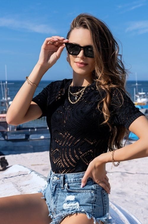 Jedna z najmodniejszych bluzek sezonu - czarna, ażurowa, miękka i elastyczna - idealna do wielu różnych stylizacji, must have tego lata. Krój podkreśla sylwetkę, krótkie rękawki zapewniają wygodę a efektowne, subtelne prześwity wprowadzają sexy nutę. Gotowa na nowości? Skład: 93% poliamid, 7% elastan.