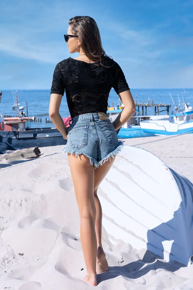 Jedna z najmodniejszych bluzek sezonu - czarna, ażurowa, miękka i elastyczna - idealna do wielu różnych stylizacji, must have tego lata. Krój podkreśla sylwetkę, krótkie rękawki zapewniają wygodę a efektowne, subtelne prześwity wprowadzają sexy nutę. Gotowa na nowości? Skład: 93% poliamid, 7% elastan.