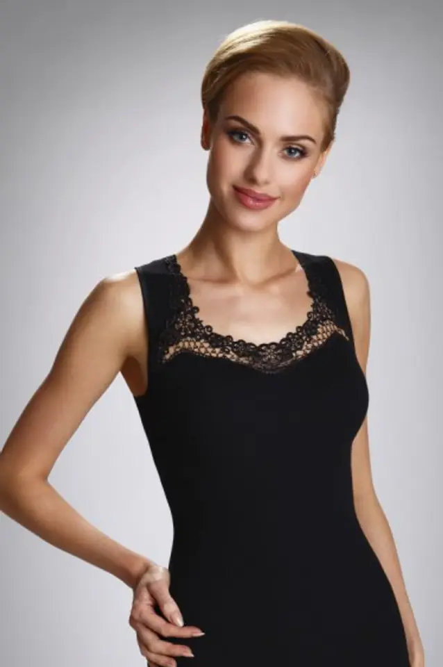 Gładka, dopasowana do ciała bluzeczka z pięknym, gipiurowym wykończeniem przy dekolcie. Na szerszych ramiączkach. Skład: 100% bawełna.