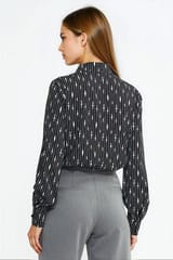 Krój regular. Materiał wiskoza, w ciekawy wzór. Klasyczny kołnierzyk z czarną szarfą pod spodem. Długi rękaw zakończony mankietem. Zapięcie na guziki z przodu. Skład: 100% wiskoza Modelka na zdjęciu ma 176 cm wzrostu i ma sobie rozmiar 36.