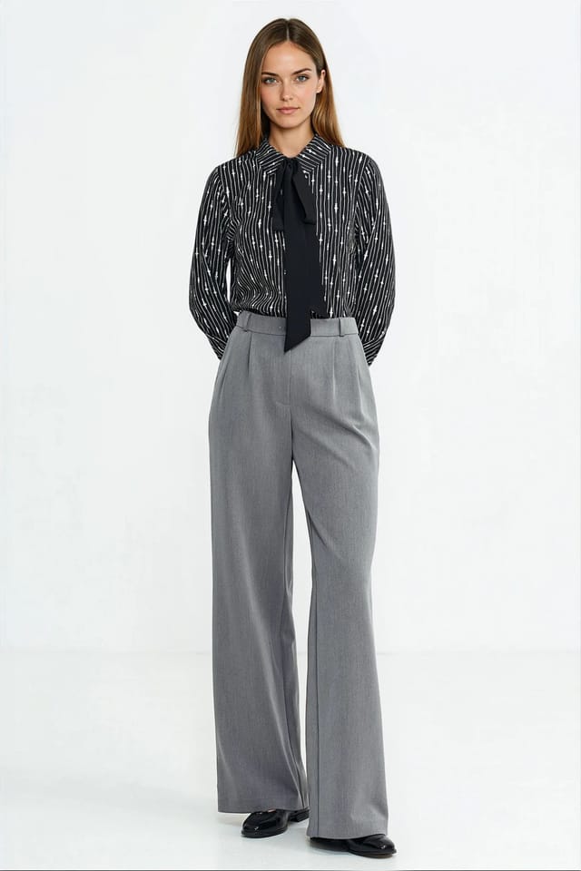 Krój regular. Materiał wiskoza, w ciekawy wzór. Klasyczny kołnierzyk z czarną szarfą pod spodem. Długi rękaw zakończony mankietem. Zapięcie na guziki z przodu. Skład: 100% wiskoza Modelka na zdjęciu ma 176 cm wzrostu i ma sobie rozmiar 36.