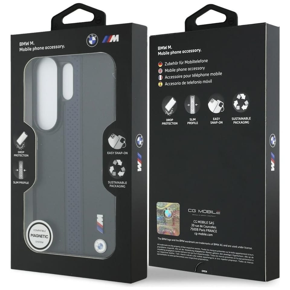 Ekskluzywne etui BMW z kolekcji M Perforated Stripe Logo MagSafe to propozycja dla wymagających użytkowników, którzy cenią sportowy design, wysoką jakość wykonania oraz nowoczesną funkcjonalność. Sygnowane przez renomowany koncern BMW, stanowi gwarancję autentyczności i prestiżu.Etui wykonano z wysokiej jakości skóry ekologicznej, która zapewnia miękkie, przyjemne w dotyku wykończenie, pewny chwyt oraz odporność na codzienne użytkowanie. Smukła konstrukcja idealnie dopasowuje się do telefonu, zachowując jego elegancki wygląd i nie zwiększając jego wymiarów. Tył obudowy zdobi metalowe logo BMW M oraz charakterystyczny czerwony, perforowany pasek, podkreślające sportowy charakter kolekcji BMW M.Czarna ramka aparatu oraz boczne przyciski tworzą spójną, nowoczesną całość, a elastyczna konstrukcja z miękkimi bokami ułatwia szybki montaż i demontaż etui. Delikatnie podniesione krawędzie wokół ekranu i aparatu skutecznie chronią urządzenie przed zarysowaniami podczas codziennego użytkowania. Konstrukcja etui amortyzuje uderzenia, zabezpieczając telefon przed upadkami.Etui oferuje pełną kompatybilność z technologią MagSafe. Wbudowany magnetyczny pierścień umożliwia szybkie, stabilne i wygodne ładowanie bezprzewodowe oraz korzystanie z akcesoriów MagSafe. Precyzyjne wycięcia na porty oraz zintegrowane osłony przycisków zapewniają pełen komfort użytkowania.BMW M Perforated Stripe Logo MagSafe to idealny wybór dla osób poszukujących eleganckiego etui o sportowym charakterze, które łączy niezawodną ochronę z wyjątkowym stylem BMW.Cechy produktu:· Wbudowany magnetyczny pierścień kompatybilny z technologią MagSafe· Wykonane z wysokiej jakości skóry ekologicznej· Sportowy design z czerwonym, perforowanym paskiem· Metalowe logo BMW M podkreślające prestiż i autentyczność· Smukły profil idealnie dopasowany do telefonu· Czarna ramka aparatu i boczne przyciski· Elastyczna konstrukcja z miękkimi bokami· Delikatnie podniesione krawędzie chroniące ekran i aparat· Skuteczna amortyzacja uderzeń i ochrona przed upadkami· Precyzyjne wycięcia na porty i zintegrowane osłony przycisków· Pewny, wygodny chwyt*UWAGA: Ładowarka MagSafe nie jest częścią zestawu