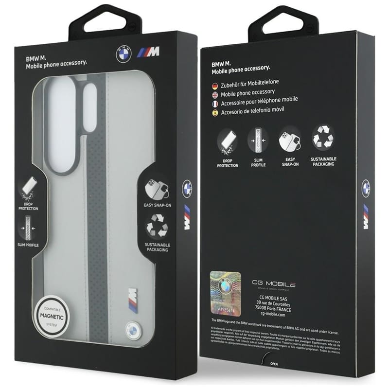 Ekskluzywne etui BMW z kolekcji M Perforated Stripe Logo MagSafe to propozycja dla wymagających użytkowników, którzy cenią sportowy design, wysoką jakość wykonania oraz nowoczesną funkcjonalność. Sygnowane przez renomowany koncern BMW, stanowi gwarancję autentyczności i prestiżu.Etui wykonano z wysokiej jakości skóry ekologicznej, która zapewnia miękkie, przyjemne w dotyku wykończenie, pewny chwyt oraz odporność na codzienne użytkowanie. Smukła konstrukcja idealnie dopasowuje się do telefonu, zachowując jego elegancki wygląd i nie zwiększając jego wymiarów. Tył obudowy zdobi metalowe logo BMW M oraz charakterystyczny czerwony, perforowany pasek, podkreślające sportowy charakter kolekcji BMW M.Czarna ramka aparatu oraz boczne przyciski tworzą spójną, nowoczesną całość, a elastyczna konstrukcja z miękkimi bokami ułatwia szybki montaż i demontaż etui. Delikatnie podniesione krawędzie wokół ekranu i aparatu skutecznie chronią urządzenie przed zarysowaniami podczas codziennego użytkowania. Konstrukcja etui amortyzuje uderzenia, zabezpieczając telefon przed upadkami.Etui oferuje pełną kompatybilność z technologią MagSafe. Wbudowany magnetyczny pierścień umożliwia szybkie, stabilne i wygodne ładowanie bezprzewodowe oraz korzystanie z akcesoriów MagSafe. Precyzyjne wycięcia na porty oraz zintegrowane osłony przycisków zapewniają pełen komfort użytkowania.BMW M Perforated Stripe Logo MagSafe to idealny wybór dla osób poszukujących eleganckiego etui o sportowym charakterze, które łączy niezawodną ochronę z wyjątkowym stylem BMW.Cechy produktu:· Wbudowany magnetyczny pierścień kompatybilny z technologią MagSafe· Wykonane z wysokiej jakości skóry ekologicznej· Sportowy design z czerwonym, perforowanym paskiem· Metalowe logo BMW M podkreślające prestiż i autentyczność· Smukły profil idealnie dopasowany do telefonu· Czarna ramka aparatu i boczne przyciski· Elastyczna konstrukcja z miękkimi bokami· Delikatnie podniesione krawędzie chroniące ekran i aparat· Skuteczna amortyzacja uderzeń i ochrona przed upadkami· Precyzyjne wycięcia na porty i zintegrowane osłony przycisków· Pewny, wygodny chwyt*UWAGA: Ładowarka MagSafe nie jest częścią zestawu