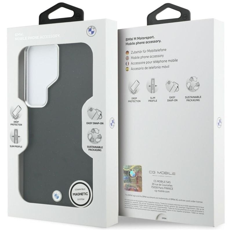 BMW Sign Metal Logo MagSafe to pokrowiec wyjątkowej jakości, sygnowany przez jeden z najpopularniejszych koncernów motoryzacyjnych na świecie. Etui stanowi idealny wybór dla osób poszukujących harmonii pomiędzy sportowym charakterem a elegancką klasyką, oferując jednocześnie pełne wsparcie dla technologii MagSafe.Powierzchnia etui została wykonana z wysokiej jakości skóry ekologicznej o drobno teksturowanej strukturze, co zapewnia pewny chwyt oraz luksusowe wrażenia dotykowe. Tył akcesorium zdobi metalowe logo BMW M, które podkreśla autentyczność oraz prestiżowy rodowód kolekcji, nadając smartfonowi wyjątkowy, motoryzacyjny sznyt.Nowoczesny i spójny charakter całości podkreślają czarna ramka aparatu oraz zintegrowane osłony przycisków. Elastyczna konstrukcja z miękkimi bokami ułatwia szybki montaż i demontaż pokrowca, a smukły profil sprawia, że telefon zachowuje swój naturalny kształt przy jednoczesnym zachowaniu wysokiej odporności na upadki.Delikatnie podniesione krawędzie wokół wyświetlacza oraz obiektywu aparatu stanowią skuteczną barierę przed zarysowaniami, dbając o bezpieczeństwo kluczowych elementów urządzenia podczas codziennego użytkowania.Etui zostało wyposażone w magnetyczny pierścień kompatybilny z ładowarką MagSafe, co gwarantuje idealne dopasowanie, mocne przyleganie oraz szybkie i wygodne ładowanie bezprzewodowe.Cechy produktu:· Wbudowany pierścień magnetyczny kompatybilny z ładowarką MagSafe· Wykonane z wysokiej jakości skóry ekologicznej o drobnej teksturze· Metalowe logo BMW M· Nowoczesna, czarna ramka aparatu i przyciski· Elastyczna konstrukcja ułatwiająca montaż· Ochrona tyłu, boków oraz przycisków urządzenia· Skuteczna amortyzacja wstrząsów i uderzeń· Podwyższone ramki chroniące ekran i soczewki kamery· Oficjalna licencja BMWUWAGA: Ładowarka MagSafe nie jest częścią zestawu