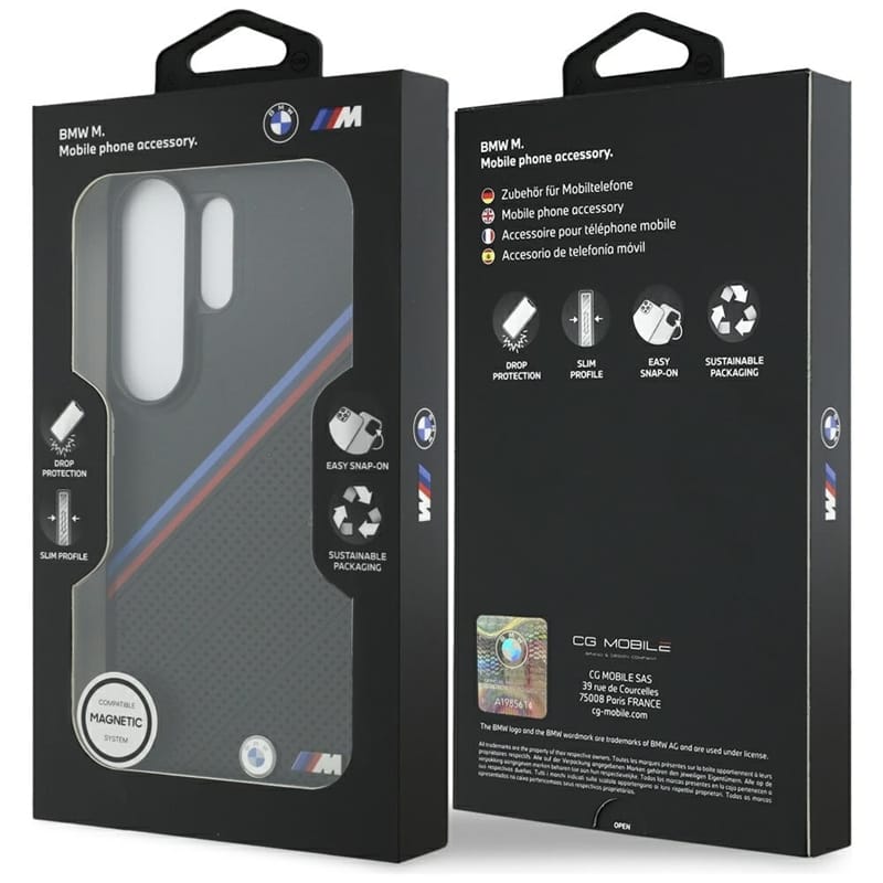 Ekskluzywne etui BMW z kolekcji Tricolor Metal Logo MagSafe to pokrowiec najwyższej jakości, sygnowany przez renomowaną markę BMW. Jest idealnym wyborem dla użytkowników urządzeń z technologią MagSafe, łącząc elegancję, sportowy charakter i funkcjonalność.Etui wykonano z wysokiej jakości skóry ekologicznej z perforowanym wzorem, co zapewnia trwałość, pewny chwyt oraz wyjątkowy, motoryzacyjnie inspirowany design. Tył zdobią charakterystyczne pasy BMW M oraz metalowe logo, podkreślające prestiż i autentyczność kolekcji.Smukła konstrukcja etui nie zwiększa wymiarów telefonu, a delikatnie podniesione krawędzie wokół ekranu i aparatu chronią urządzenie przed zarysowaniami. Elastyczne, miękkie boki ułatwiają szybki montaż i demontaż, zachowując pełną funkcjonalność telefonu.Etui jest w pełni kompatybilne z technologią MagSafe. Wbudowany magnetyczny pierścień umożliwia szybkie i stabilne ładowanie bezprzewodowe, a magnesy zapewniają mocne przyleganie telefonu do ładowarki. Precyzyjne wycięcia na porty oraz zintegrowane osłony przycisków gwarantują pełen komfort użytkowania.BMW Tricolor Metal Logo MagSafe to idealne etui dla osób szukających eleganckiego, smukłego i funkcjonalnego pokrowca, który łączy luksusowy wygląd z niezawodną ochroną telefonu.Cechy produktu:· Wbudowany magnetyczny pierścień kompatybilny z technologią MagSafe· Wykonane z wysokiej jakości skóry ekologicznej· Perforowany wzór oraz charakterystyczne pasy BMW M· Metalowe logo BMW podkreślające prestiż i autentyczność· Smukły profil idealnie dopasowany do telefonu· Delikatnie podniesione krawędzie chroniące ekran i aparat· Elastyczne, miękkie boki ułatwiające montaż i demontaż· Precyzyjne wycięcia na porty i zintegrowane osłony przycisków· Skuteczna ochrona przed upadkami i uszkodzeniami· Pewny, wygodny chwyt*UWAGA: Ładowarka MagSafe nie jest częścią zestawu