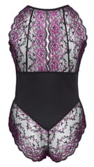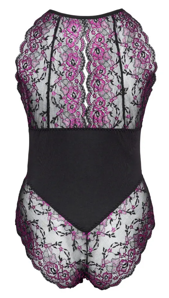 Na szlachetne chwile uwodzenia!Przezroczyste body Cottelli CURVES wykonane z delikatnej dwukolorowej koronki o kwiatowym motywie z nieprzezroczystą wstawką w talii. Wyrafinowane wycięcia z przodu i z tyłu, zapięcie na zatrzask na szyi. W części koronkowej majteczki z erotyczno-praktycznym zapięciem w kroku typu press-stud.45% poliester, 45% poliamid, 10% elastan.